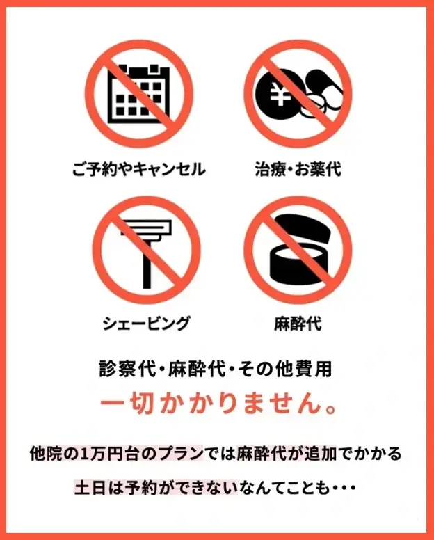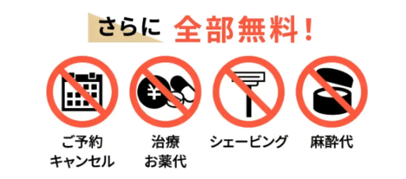 ※火傷・ひりつき・赤み・毛嚢炎・硬毛化・増毛化のリスクがあります。レーザー照射が原因で肌トラブルが起きた場合、医師が診察を行い、追加費用なしで症状に応じたお薬を処方いたします。